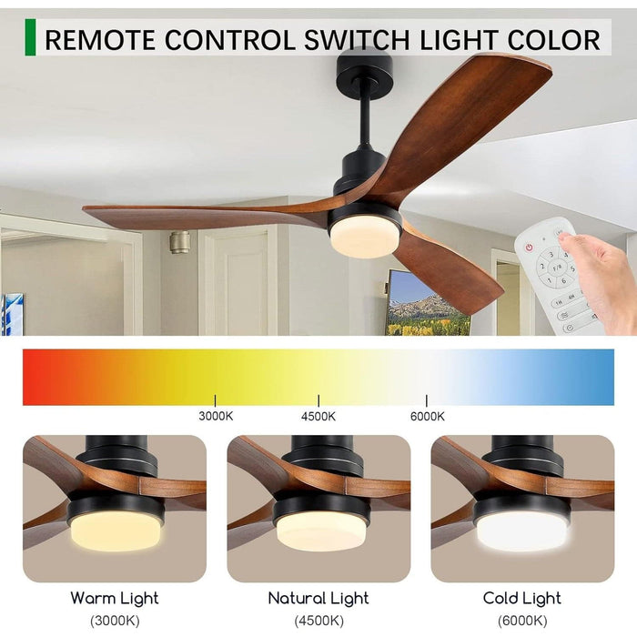 This 52 in. outdoor ceiling fan with lights features a modern design with three walnut wooden blades, perfect for patios, porches, bedrooms, and living rooms. It includes a noiseless, energy-saving DC motor with six speeds and a reversible function for year-round comfort. The fan is equipped with a remote control for easy operation, allowing you to adjust fan speed, set timers, and change light color temperatures. The fan's quiet operation ensures a peaceful environment, and its real wood blades are manually balanced for stability. Ideal for both indoor and outdoor use, this ceiling fan combines functionality with elegant design.